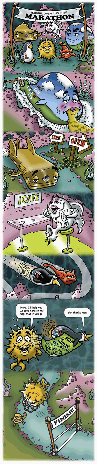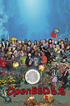 Every 6 months the OpenBSD project has the pleasure to release our software with artwork and a matching song. Theo and some other developers mutate a theme (from a classical setting, a movie, or some genre) into the fishy world of Puffy, to describe some advance, event or controversy the project went through over the previous six months. To match the art released with the historical CD sets, we joined up with some musicians we know to make at least one song.